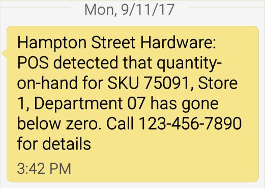 This is an example of the text message sent for the “QOH has gone negative” alert.