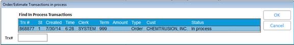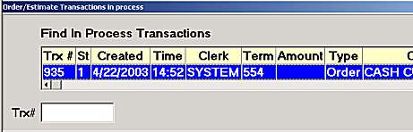 In the window that displays, select the transaction from the list or type the transaction number in the Trx # box, and click OK.