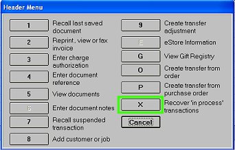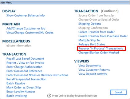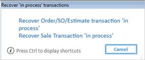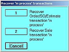 From the "Recover in-process transactions" dialog box that displays, select Recover Order/Special Order/Estimate transaction in process.Recover Order/SO/Estimate transaction "in process"; Recover Sale Transaction "in process"