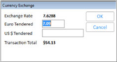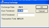 In the Currency Exchange box, the amount of foreign currency needed to complete the sale displays. Type the amount of foreign currency your customer gives you, and click OK.