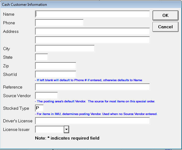 For cash accounts without an address, the Customer Information window will automatically display if the transaction contains an item whose Tally field is set to A, P,R,S,T, or X, and option 3 "Default Criteria for Purging Special SKUs" is not blank in Options Configuration.