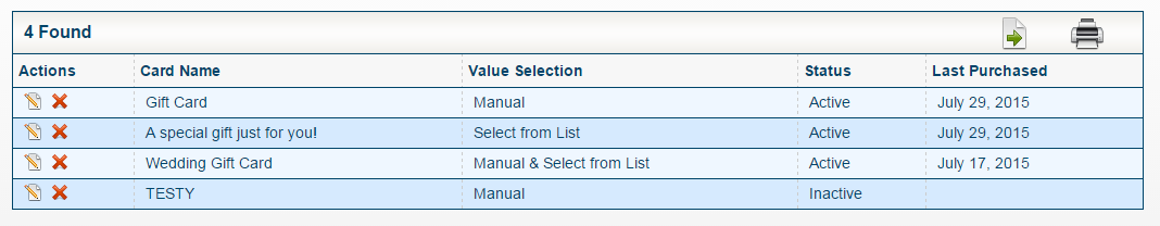 iNet will allow multiple eGift Cards to be set up. In the eGift Card list, you can edit or delete of any eGift Cards set up.