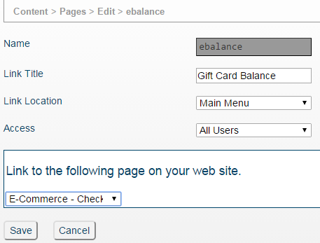 ECommerce sites can also create a link for user to check their eGift Card Balance. A custom link available in Content->Pages->Add Link for eGift Card Balance Display can be setup. Once this link is setup eGift Card recipients can view card balance by entering the eGift Card number with pin and then clicking the Check Balance button and the available balance will display.