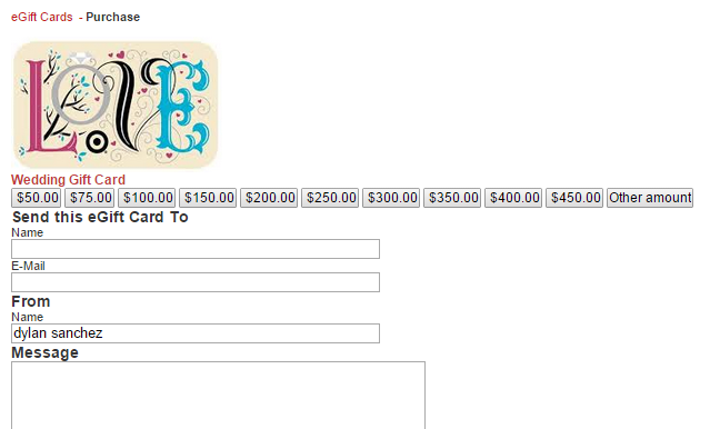 When a customer selects the “Purchase eGift Card” link they are taken to the Page that was created for this purpose. In this page they will specify the recipient Name, E-mail address as well as From details and message.