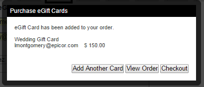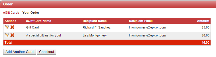 View order allows purchaser to order multiple eGift Cards and view, edit, delete, add another card and checkout.