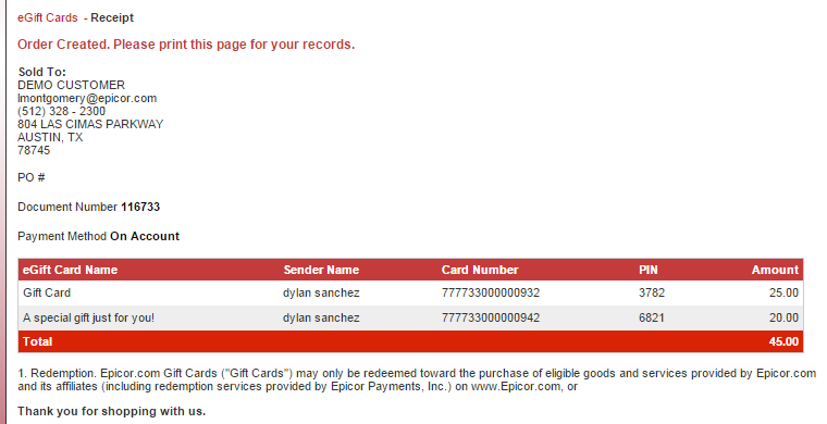 The checkout and payment process for an eGift card is completely separate from the product cart checkout process. The customer may pay by credit card or use their open account to pay for the cards. The eGift Card Checkout Page shows a summary of eGift Cards selected with the details compressed (click to expand). Purchases for eGift Cards and regular merchandise must be done separately. The standard ecommerce checkout options are available within eGift Card checkout. Once transaction is complete the eGift Card will be emailed to the recipient and a receipt with eGift Card information is set to the purchaser.