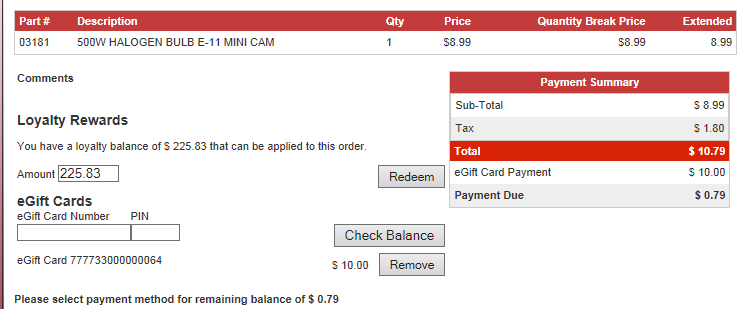 By entering the eGiftcard number with pin and then clicking the Check Balance button customers will see the available Gift Card balance. Then the available balance will appear and then the full or partial amount can be applied to the transaction.