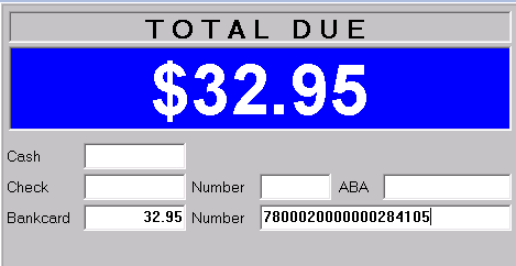 Tab to the Bankcard field and press Enter to auto fill the Bankcard field with the amount due. Then type in the card # from the email printout followed by the pin # (no space in between):