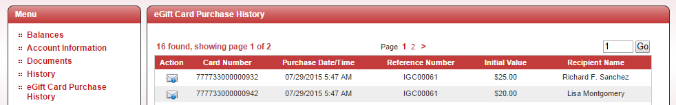 Once eGift Card is setup signed on users will have the ability to view past eGift Card purchase by clicking on “eGift Card Purchase History”. From this screen a Purchaser can resend eGift Card information to recipient if the card still has value by clicking on the “Action” envelope. They can also correct an email address of the recipient and the email text if required.