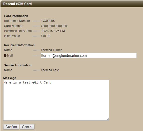 Once eGift Card is setup signed on users will have the ability to view past eGift Card purchase. Purchaser can also resend eGift Card information to recipient if the card still has value.