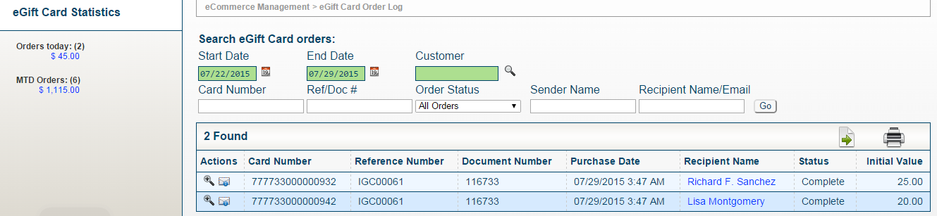 This handy log shows current order and MTD eGift Card Statistics as well as detail eGift Card information. The searching field allows search list by status, date range, gift card #, reference #, invoice number, and sender/recipient name or e-mail. Default to show items in the “completed” status only.
