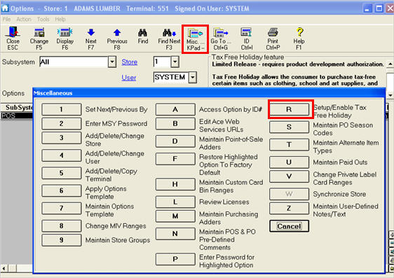 To make additions, changes, or deletions to the categories and selected stores, in Options Configuration click Misc, and select R – Setup/Enable Tax Free Holiday. Then select the appropriate button.