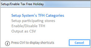 3 – Enable/Disable TFHThis option allows you to enable or disable the Tax Free Holiday (TFH) and to modify the Last Date the TFH is to be active.