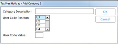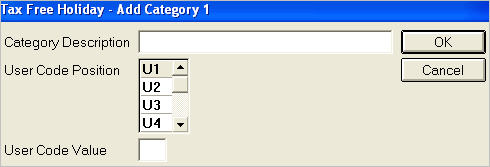 Category DescriptionEnter up to 32 characters to identify the item or group of items. The Category Description should be a name or phrase that identifies the item or group of items with the assigned user code and user code value. For example, if the group of items you wish to include in the Tax Free Holiday is clothing, the Category Description would be "Clothing."