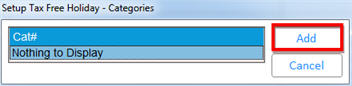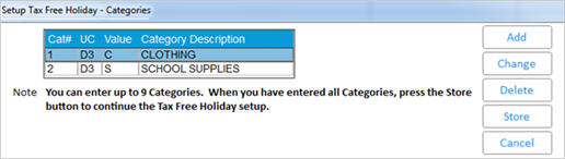 1 – Set up System’s TFH CategoriesThis takes you to the Setup Tax Free Holiday – Categories prompt, where you can Add more categories if all nine have not been used yet, and to Change and Delete existing categories.