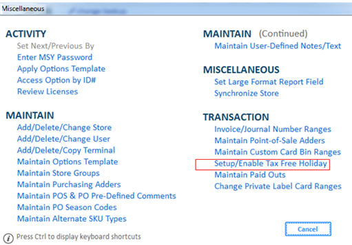 In Options Configuration, click Misc and select Set up/Enable Tax Free Holiday.
