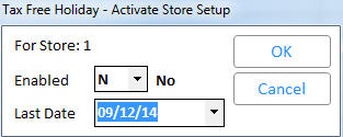 EnabledThis field determines if the Tax Free Holiday (TFH) is active. When set to Yes, the item(s) that meet the store and category criteria post as nontaxable. When set to No, the item(s) that meet the store and category criteria post under normal conditions using the store and/or customer setup.