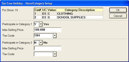 Participate in Category XWhere X is the category number, this field determines whether a specific category in a specific store participates in the Tax Free Holiday (TFH). Set this field to Yes for each of the participating categories. Leave the categories that will not be participating to N-No.
