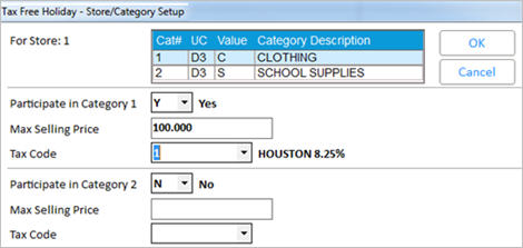 - In Options Configuration use Misc Menu “Setup/Enable Tax Free Holiday” to add a category for the clothing and footwear this exemption applies to. Entering the user code position and value you’ll use to identify these items, and then enter the stores that will participate, and then enter the max tax exempt amount in the Max Selling Price and the 0.00% tax code to use for items whose selling price is below the Max Selling Price.