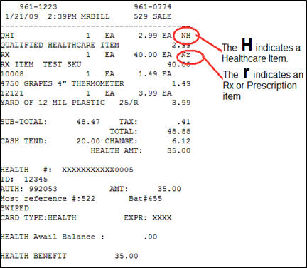 The Sale completes after final payment is taken. The customer receipt prints immediately with line item indicators identifying each SKU that was paid by an EBT card.