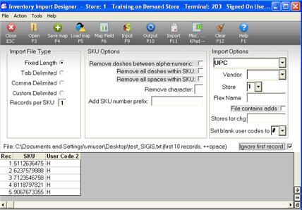 Click Output (F10). Make sure there is a check mark at the Ignore First Record box. The UPC codes, and the letter H or R, display at the bottom of the screen for the first ten items on the list.