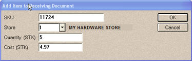 Enter the SKU, Store (if multistore), Quantity received, and the Cost of the item, and click OK. The item is added and posted to the receiving document.