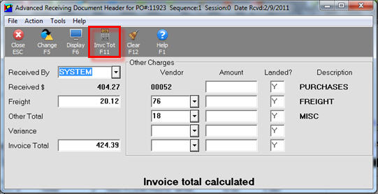If desired, from the Document Header window, you can click Invc Tot (F11) so that the system adds the amounts currently showing in the ‘Received $’, ‘Freight’, and Other Total fields, and updates the Invoice Total field with this amount. Doing this eliminates any potential variance. Once the Invoice Total has been calculated, press Change (F5) before closing this window to write that new Invoice Total back to the receiving document.