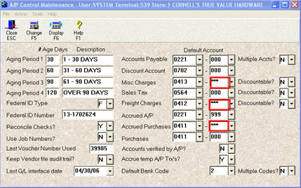 So that Advanced Receiving Misc Charges, Freight Charges, and Accrued Purchases are passed off to the correct department, you must enter asterisks (***) as the sub-account (last three digits) for these three accounts in the A/P Control Maintenance (ACON) window. The procedure to do so is described below.