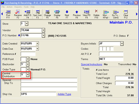 When creating multistore purchase orders for Centralized Distribution, you can use any creation method you prefer. For example, you may use the Suggested Order Report (RSO), or you may manually create a PO in the Purchasing and Receiving window. You may also use BPO, the Combine Purchase Order utility, to combine individual stores' POs into one PO for the distribution center (DC). The important point is to make sure that the PO is created in the DC, and that all items are marked as being ordered for the appropriate store.