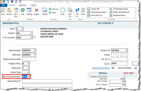 Display the multistore PO in the Purchasing and Receiving window and verify that the Central Distribution field is set to Y. If it is not, change it at this time.