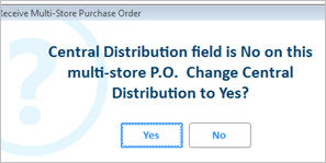 If you didn't change the Central Distribution flag to Y when you created the PO, the following dialog displays when pressing Receive (F2) on a status F or status P purchase order. Be sure to answer Y to change the flag now.