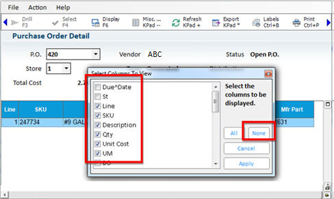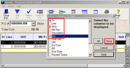 - Right click on a column heading, and click Select Columns to View. Then click None to clear all checkmarks. Next, place a checkmark by Store, SKU, and Qty.