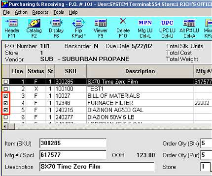 Click OK. The item changes to status X (canceled), and remains as such unless it is purged by the Purchasing Master File Print Report (RPP).
