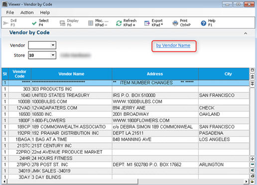 - By default, the Vendor Viewer displays in Vendor Code order. If you'd rather display by Vendor Name, click the "by Vendor Name" link.