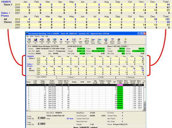 When you display an item from the Item or Store tab, the top group contains the stores’ sales totals and the lower group is for all stores associated with the purchase order. If desired, click Flip to cycle through various views that include and exclude promotional sales history.