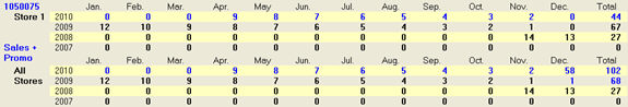 The item sales history area of the PO Worksheet can show up to four years of sales history for an individual item. The first group of four years is specific to a store or DC, and the second group includes all stores currently assigned to the purchase order. Blue font indicates that some portion of the total number shown was sold on a promotion. To see the details of what was sold on promotion vs. regular sales, click Flip, which cycles through various views, allowing you to see sales plus promo, just promo, or just sales for each of these periods. Note that if you use Markdown Promotions, they display by themselves and are not included in any of the other totals.
