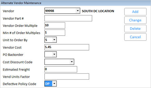 Vendor CostIf this vendor is the same as the Primary vendor, or if the vendor code is one of your distribution center (DC) locations, set this to the Replacement cost. Product is sent to the stores via transfer; this cost is used to allow the buyer to view the estimated total for the transfers. Note: If you have an alternate vendor that matches the Primary vendor, changing the replacement cost on the Pricing tab automatically changes the same vendor’s cost on the Alternate Vendor tab.