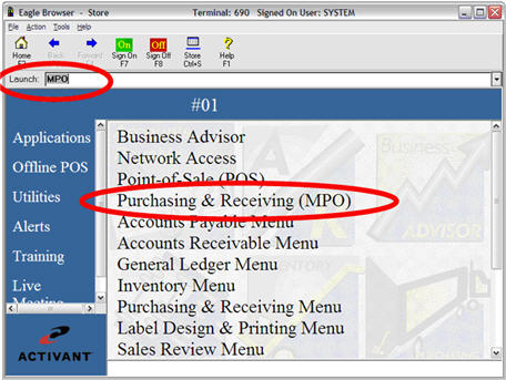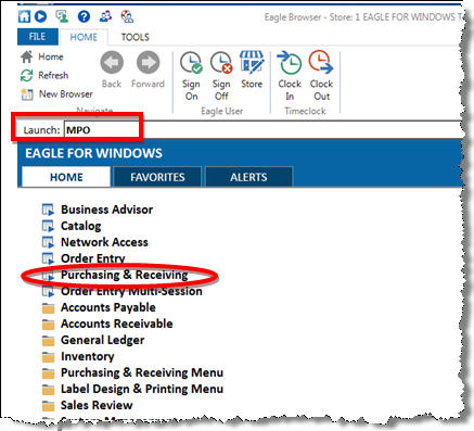 From the Eagle Browser, type MPO in the launch bar, and press Enter. (Alternatively, you can click Purchasing & Receiving from the Browser menu.)