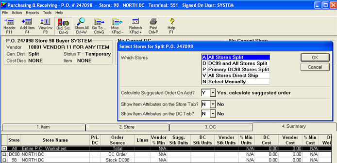 From the Summary tab that opens, in the dialog, enter the stores you want to include on the order. Your choices vary based upon the central distribution type you chose. Also in this dialog are choices about if you want to automatically use the suggested order feature, and if using the softgoods feature, if you want to see item attributes (defaults for the suggested order feature and attributes come from the settings in Options Configuration).