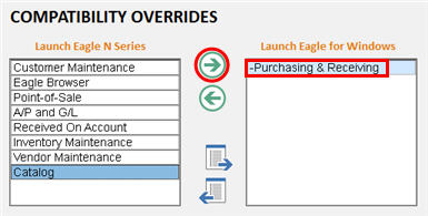 PO Worksheet is currently not available in Eagle N Series. For any terminals at which you are using PO Worksheet, you must go into Compatibility Settings and make sure that Purchasing & Receiving is in the Eagle for Windows mode (the box on the right). If it is not already there, click the green right-arrow to move Purchasing and Receiving to Eagle for Windows.