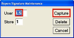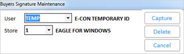 In the Buyer's Signature Maintenance dialog, enter the user name of the buyer (the user name must be on file in the Eagle system), and click Capture.