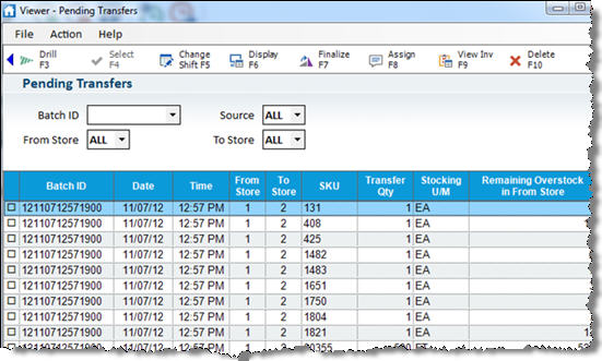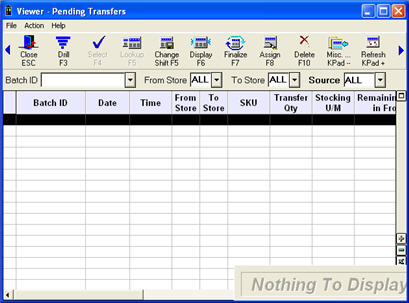- Use the fields at the top of the window (Batch ID, From Store, To Store, and Source) as needed to display the pending transfer(s) you want to view. When the From Store and To Store are the same, the viewer shows all pending transfers "coming to" that store, and all pending transfers "going out" of that store.