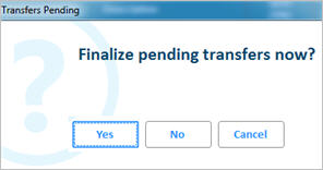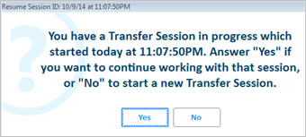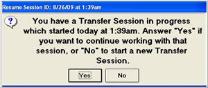 If you close out of the Purchasing window for any reason during Inventory Balancing without finalizing, and then choose to start back up again on the same day using the same user and terminal, the system will find the previous session and ask if you want to resume it. If you answer yes, additional balancing will post to the same transfer session previously started. If you answer no, a new transfer session will be started and you will have the opportunity to finalize both when closing out of Purchasing.