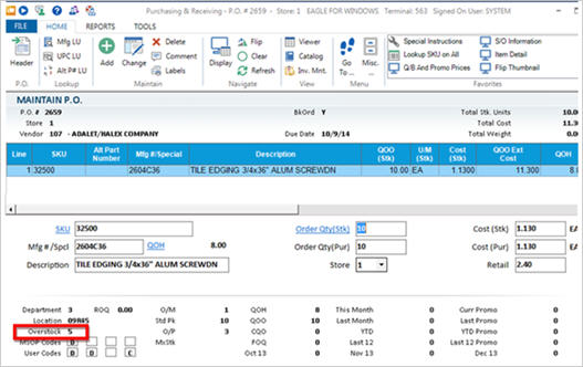 Type an SKU that needs stock quantity filled in this store, and press Enter. Notice that the "Overstock" quantity displays near the bottom of the screen.