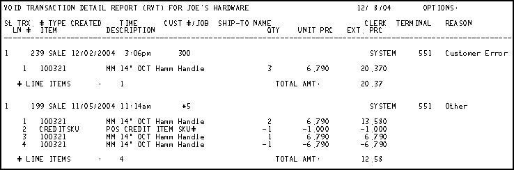 This topic provides an example of the Void Transactions Report (RVT) and definitions of the fields on the report. For more information about RVT and procedure steps for running the report, click here to go to the online help topic. This report is available from both the Eagle Browser and Network Access.