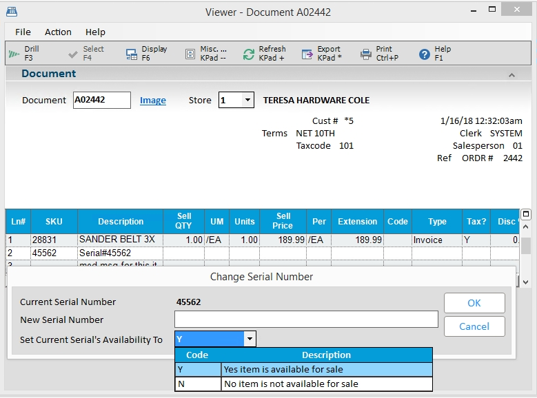 Use QuickRecall Viewer to change the existing serial number of an item on an archived transaction. At the time of changing the serial number you can indicate whether the unit with the serial number being replaced will be available for a future sale.