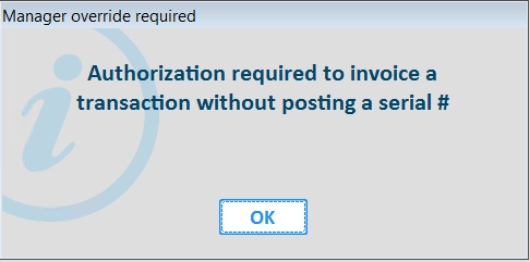 If you select Yes to continue invoicing without a serial number and you do not have security bit 1143, the Manager override required dialog displays: