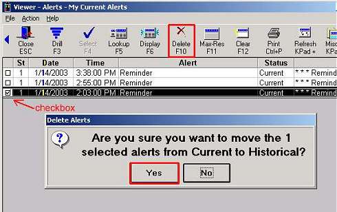 (Optional) To change the status of a current alert to historical (see the "Status" column to verify the status of an alert), click the checkbox to the left of the alert, then click Delete on the toolbar. Then click Yes to confirm the deletion.