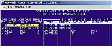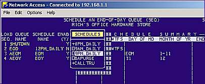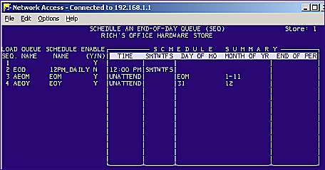 From the Network Access Function prompt, type SEQ and press <Enter>. The Schedule and End-of-Day Queue screen displays.