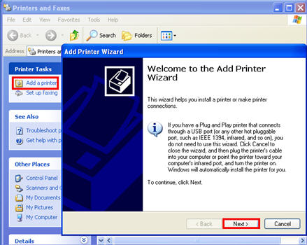 Click Add a Printer. When the Wizard displays, click Next.